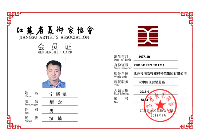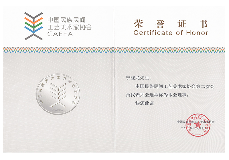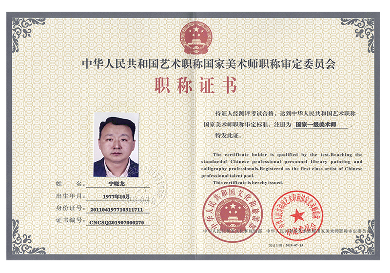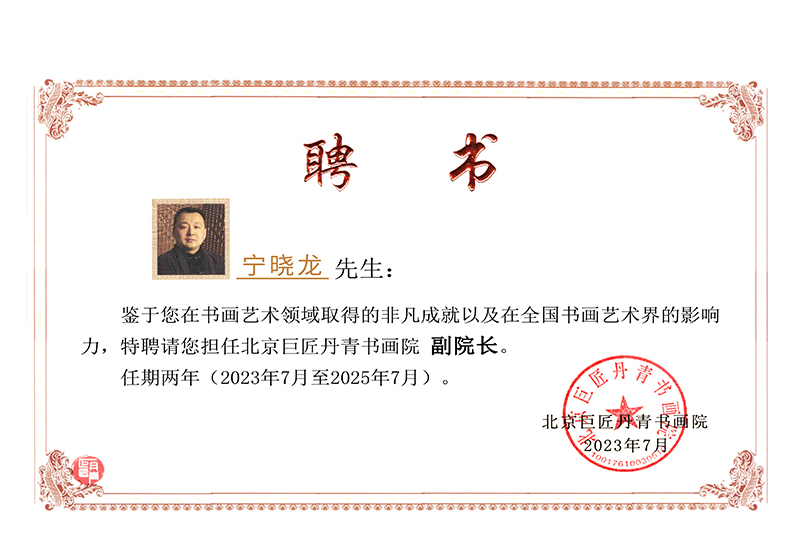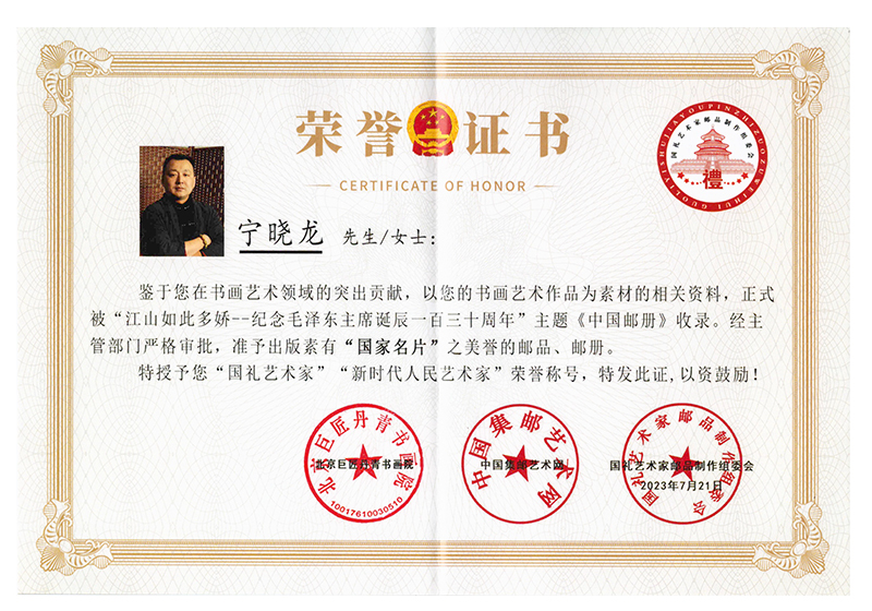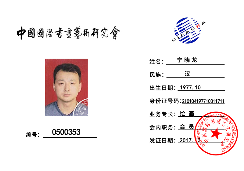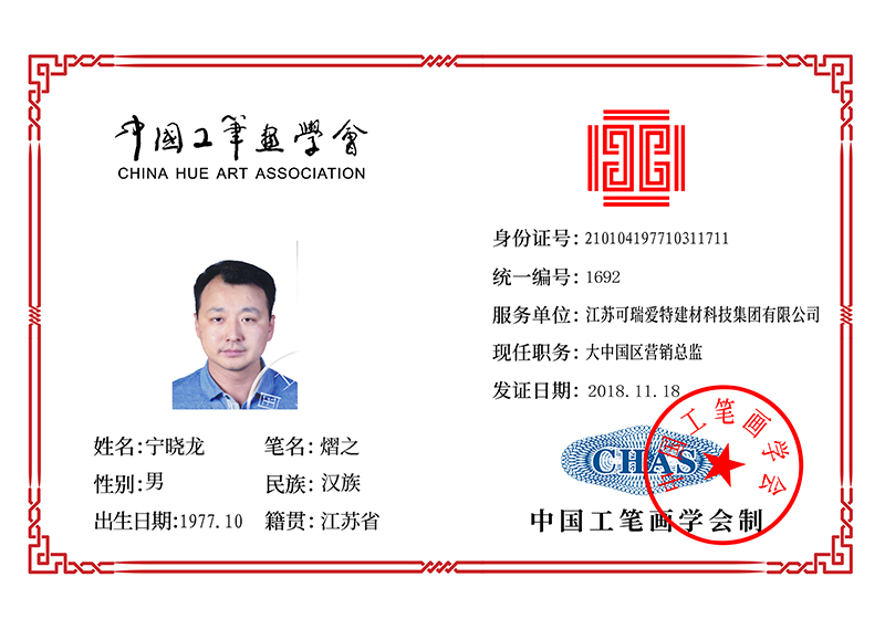 在企业不断发展壮大的同时,宁晓龙先生始终未忘从小热爱的美术专业。经过不懈努力,他已成为“中国美术家协会会员”、“国家一级美术师”、“中国民族民间美术家协会常务理事”、“中国国际书画艺术研究会会员”、“中国工笔画学会会员”、“中国工艺美术协会会员”等,还被北京巨匠丹青书画院特聘为副院长。